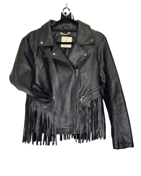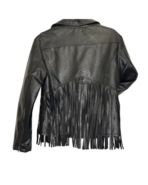 Chaqueta cuerina negro con flecos.