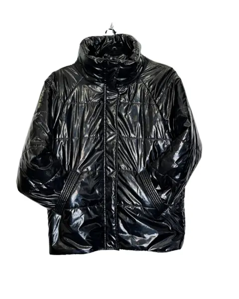 Chaqueta puffer negra con cierre de cremallera y botones de clip.