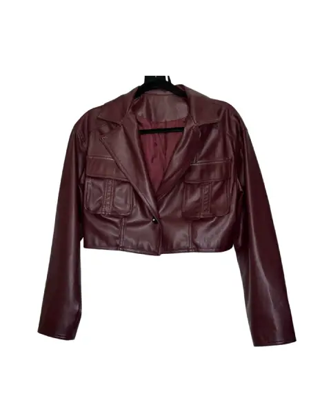 Chaqueta tipo crop top de cuerina vinotinto, cierre de botones.